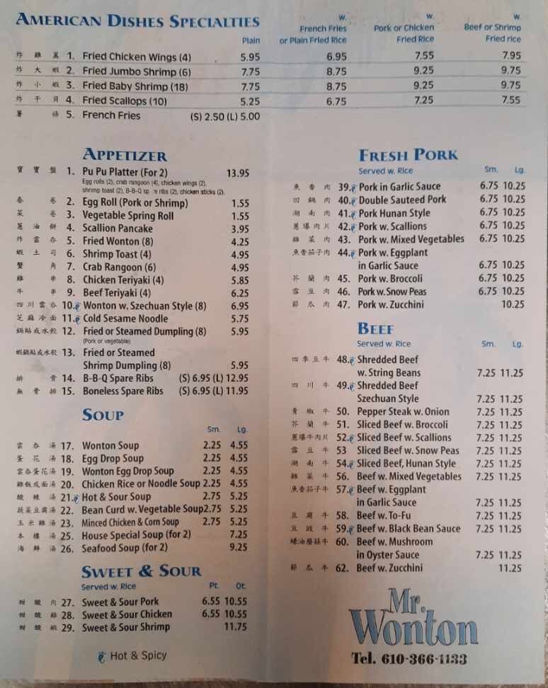 “ We transferred to Mr. wonton after giving it a try because another location was constantly having issues with orders. When Mom is running the orders and cooking. Everything is PERFECT. However recently when the younger son has been we have had a few minor order problems (wrong rice with meal, food didn't seem as good or overdone). Although 2 out of the last twenty times that's not bad ”